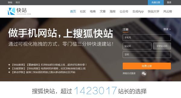 其實,早在2014年互聯網巨頭之一的搜狐就創立了H5建站云平臺搜狐快站,為中小企業量身打造個性化的網頁。搜狐快站采用的是拖拽建站的模式,用戶只需要輕松拖拽組件,就能快速建出功能強大而又極具個性化的手機網頁。同時,這也是順應輕技術的時代趨勢,以免費建站切入市場的一個良好的產品形態的發展。而在今年9月到10月,搜狐快站即將上線云商店和移動建站兩大重要項目,進一步為用戶節省時間和成本,為用戶提供模板,插件交易云平臺以及更為便利化的手機端直接建站服務。