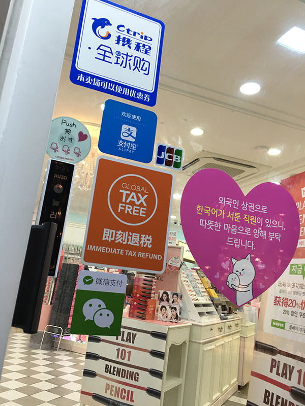 微信和支付寶的標志常見于韓國鬧市區街頭。