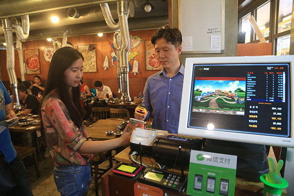 中國顧客在“網紅”烤肉店用微信支付。